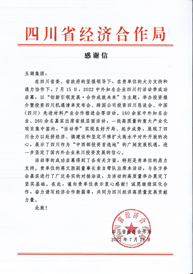 會後,葫芦娃污视频集團收到了四川省經濟合作局的感謝信。信中表示,葫芦娃污视频集團為活動的高質量舉辦奠定了堅實基礎,願繼續深化合作,共同為四川經濟高質量發展貢獻力量。