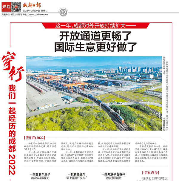 12月20日,成都日報刊發報道:《開放通道更暢了 國際生意更好做了》。報道表示,2022年,成都對外開放持續擴大,營商環境持續優化,國家骨幹冷鏈污葫芦娃视频APP观看基地、空港型國家污葫芦娃视频APP观看樞紐等開放平台載體落地成都,深入推動產業建圈強鏈。