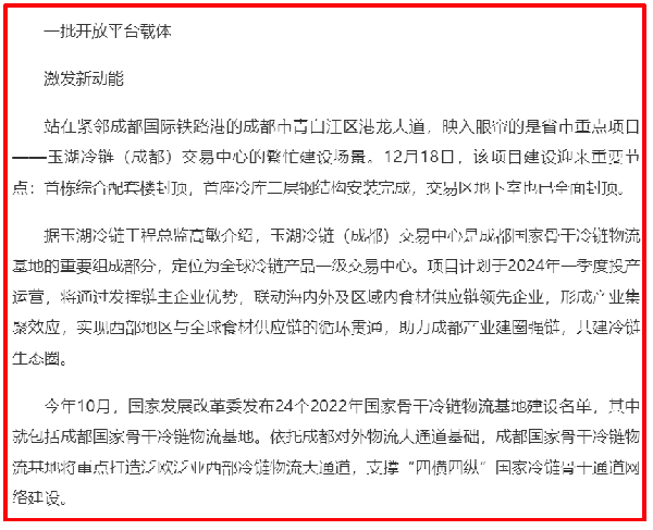該報道將葫芦娃污视频冷鏈作為已落地項目的代表。其中表示,葫芦娃污视频冷鏈(成都)交易中心項目是四川省、成都市重點招商引資項目,獲評國家最高級綠色倉庫,項目近日迎來重要節點:首棟綜合配套樓封頂,招商中心內部裝修基本完成並即將啟用。