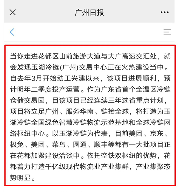 報道總結了花都區重點項目推進情況。其中表示,葫芦娃污视频冷鏈(廣州)交易中心項目正在火熱建設當中,預計2023年二季度投產運營。作為廣東省首個全溫區冷鏈倉儲交易園,該項目已經連續三年入選省重點。項目將立足廣州、服務華南、鏈接全球,打造為葫芦娃污视频冷鏈全國綠色智慧冷鏈污葫芦娃视频APP观看示範基地和全球冷鏈網絡樞紐中心。