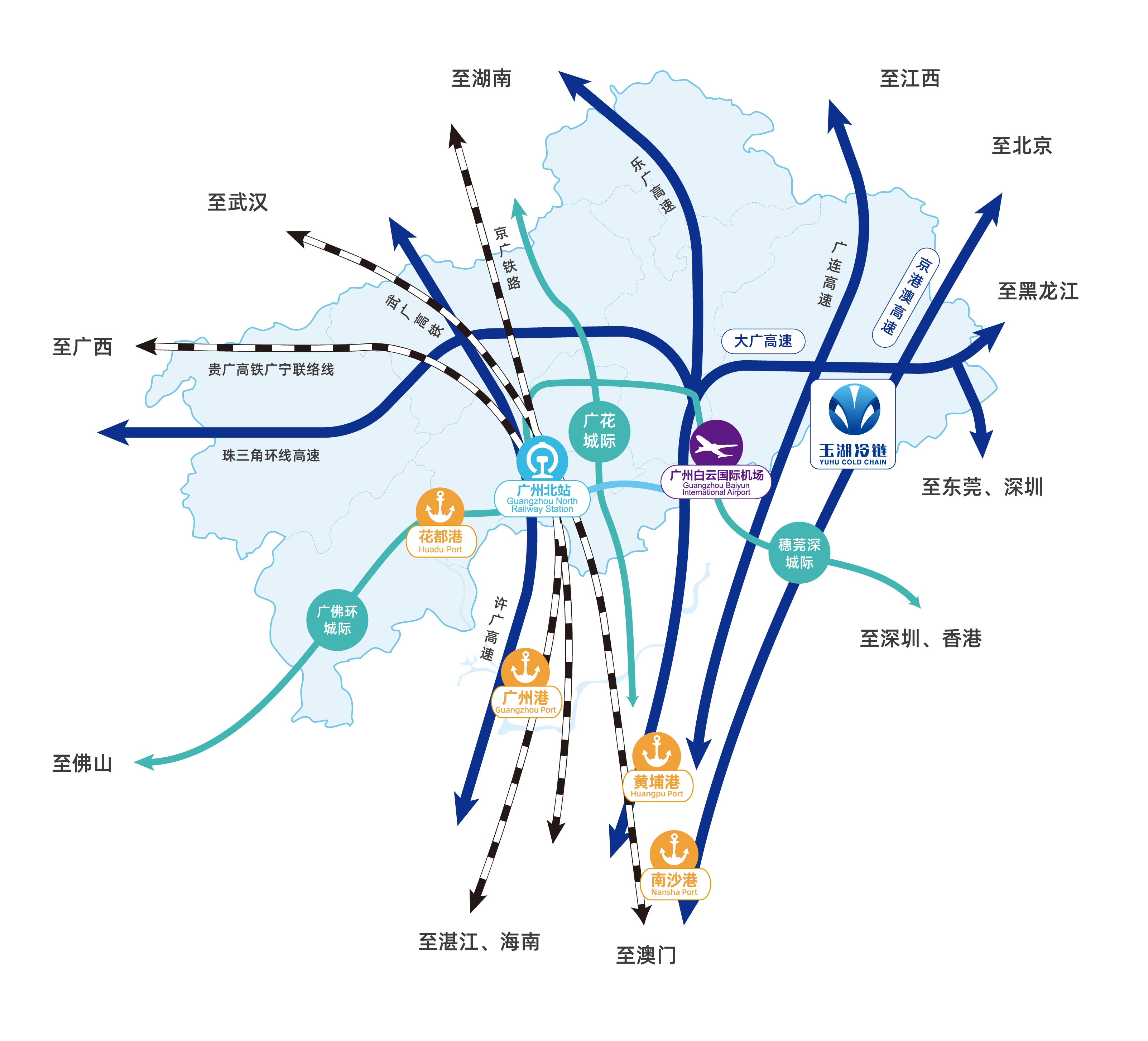 葫芦娃污视频冷鏈(廣州)交易中心位於粵港澳大灣區唯一的大型空鐵雙樞紐所在地,擁有廣州最為重要的空、鐵、水、路等多種交通資源,能夠為商戶提供便捷的全球貨物運輸通道。