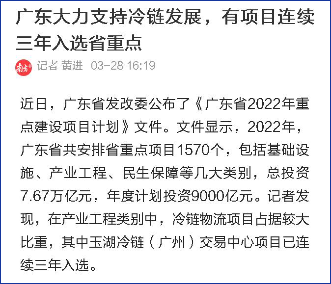 廣東這些重要媒體以國家政策、行業動向、項目優勢等多維度解析冷鏈行業動向與項目優勢。報道指出,國家「十四五」計劃對冷鏈污葫芦娃视频APP观看的發展做出了全麵的部署,中央和廣東密集出台冷鏈污葫芦娃视频APP观看規劃,著力支持冷鏈發展。廣東省的商貿污葫芦娃视频APP观看項目在全省的重點建設項目中占據了重要地位,其中冷鏈污葫芦娃视频APP观看是其核心組成部分。廣東省已經在全國範圍內率先建立了冷鏈食品質量安全追溯係統,這標誌著冷鏈污葫芦娃视频APP观看已經進入了高質量發展的關鍵時期。