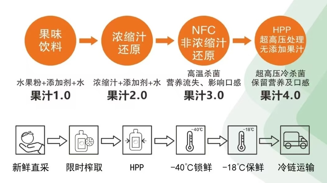 凍鮮果汁之所以能夠在競爭激烈的茶飲市場脫穎而出,離不開HPP技術的應用。這項技術通過600兆帕的壓力殺菌,相當於在海底6萬米的壓力下殺滅微生物,而不會破壞水果中的營養成分。與傳統的熱殺菌不同,HPP技術不僅能保留果汁的天然風味,還能保留天然抗氧化劑以及維生素、礦物質等營養成分,從而使產品在市場上更具競爭力。果然食品的生產流程遵循“冷榨、冷殺、冷藏”三冷標準流程,直采新鮮水果,48小時內限時榨取,通過 HPP 超高壓冷殺菌後,即刻在零下40度冷庫中速凍鎖鮮,再以零下 18 度儲存,確保從采摘到消費者手中的每一步都精益求精。