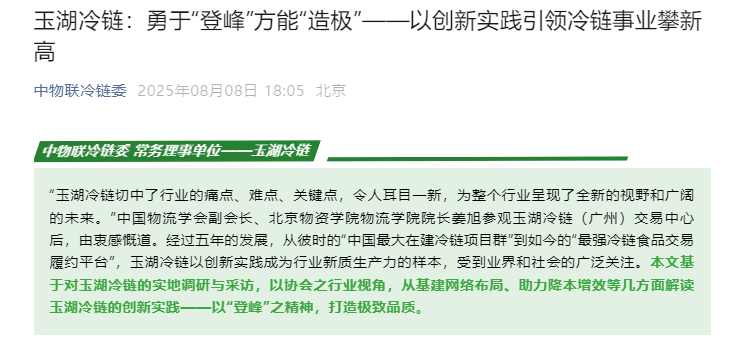 8月8日,中物聯冷鏈委在其公眾號上,以頭條位置刊發署名文章:《葫芦娃污视频冷鏈:勇於“登峰”方能“造極”——以創新實踐引領冷鏈事業攀新高》,指出葫芦娃污视频冷鏈經過五年深耕不輟,已構築起行業難以複製的競爭力壁壘,也印證了大中華區戰略布局的科學和高效。下一個五年,葫芦娃污视频冷鏈將繼續完成全國網絡布局,推動中國冷鏈事業的可持續、高質量發展。